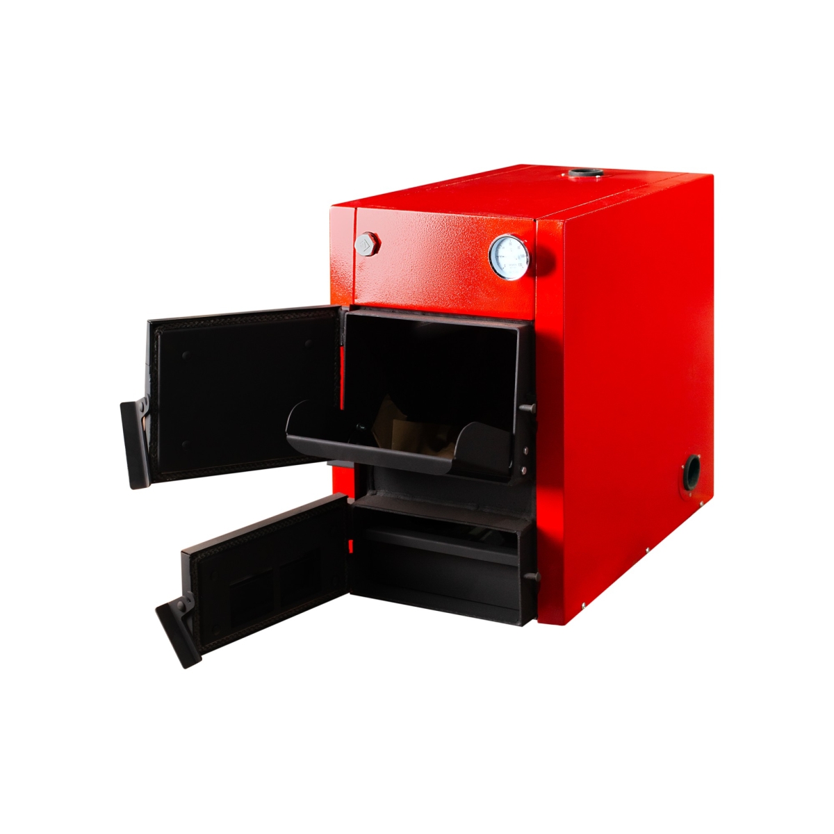 На котле установлены: дверь загрузочная, зольный ящик, чугунный колосник, заглушка переходник с G2½ на G1½, блок ТЭН, термометр, ящик зольника.